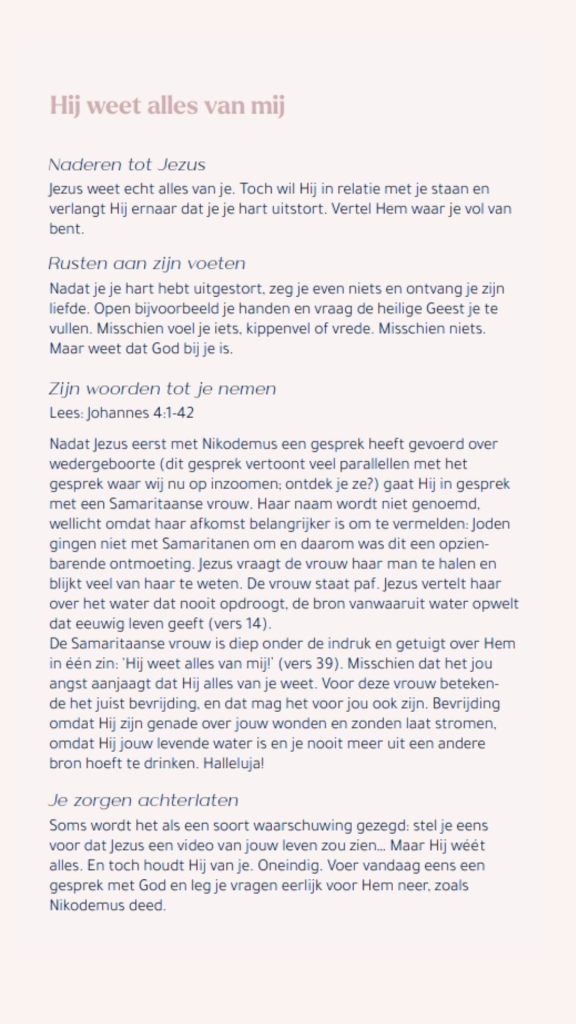 Een mariamoment is een moment aan de voeten van Jezus. Zoals Maria doet in het verhaal in Lukas 10. Zij zit aan de voeten van Jezus, temidden van de chaos. Terwijl haar zus Martha druk rondrent. Misschien herken je van beide wel een beetje. Het is herkenbaar als je graag alles op orde hebt. En je voelt misschien wel het verlangen om vaker naar Jezus te luisteren. Jezus zegt tegen Maria: ‘Jij hebt het beste deel gekozen.’ Wij geloven dat je elke dag opnieuw mag thuiskomen bij God.