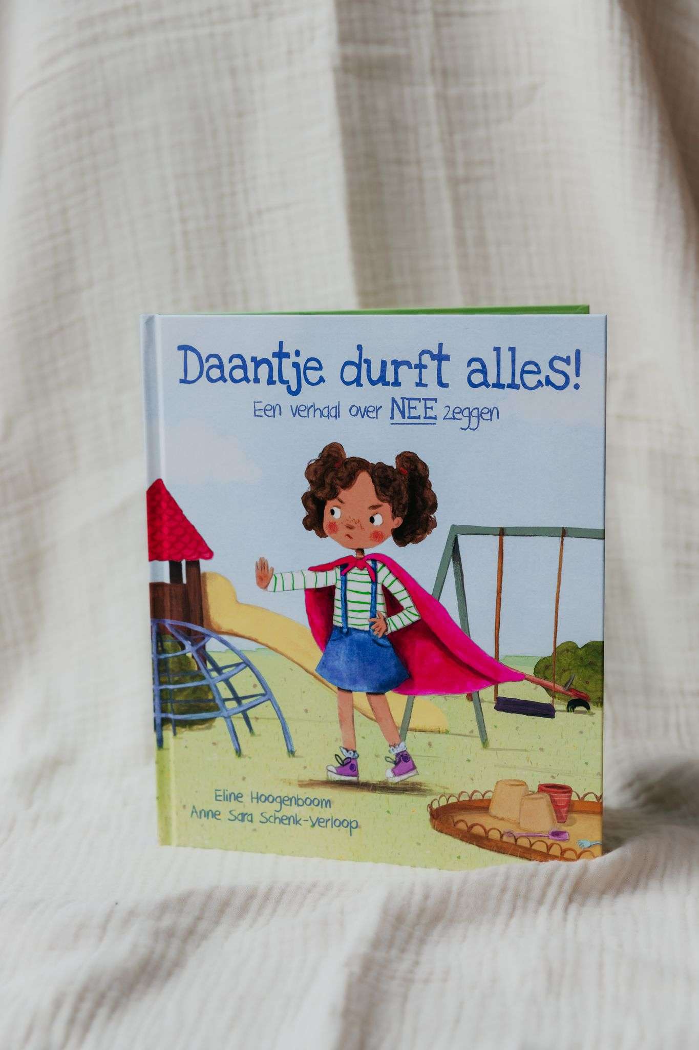 Als Daantje op Durfal Dinsdag in haar superheldencape naar de speeltuin gaat, neemt ze zich voor dat ze alles durft. Maar die karretjes zijn toch wel heel hoog en snel… Durft ze het durfalwoord NEE te gebruiken? En wat doet ze als een juf haar haar aan wil raken? Daantje zegt nee! is een vrolijk verhaal dat elk kind herkent. Dit prentenboek zet in op zelfvertrouwen, en nee durven zeggen als je iets niet fijn of leuk vindt.